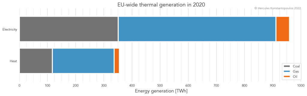 For screen readers: in 2020, EU-wide fossil generation was 959 TWh of electricity and 355 TWh of heat. That’s a lot of TWh, a tricky number to parse. What proportion of the generation mix did fossils represent?