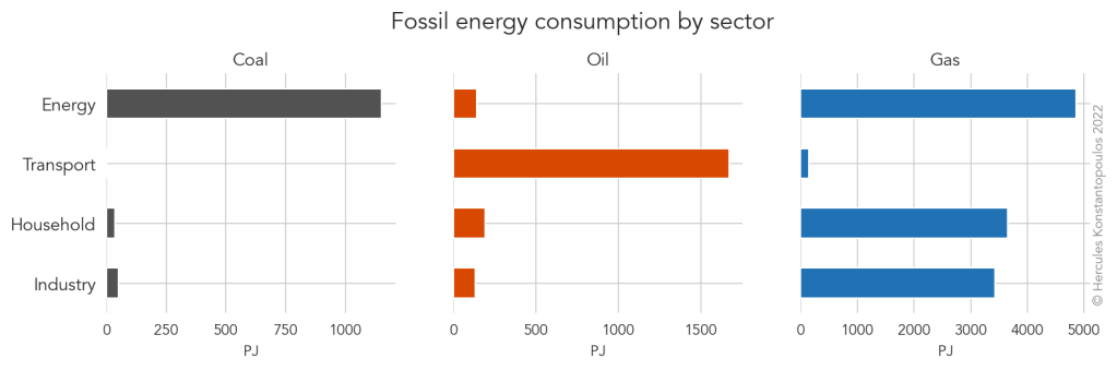 Coal and oil are dominated by a single sector, but gas is more widely used. Let’s look at each fuel.