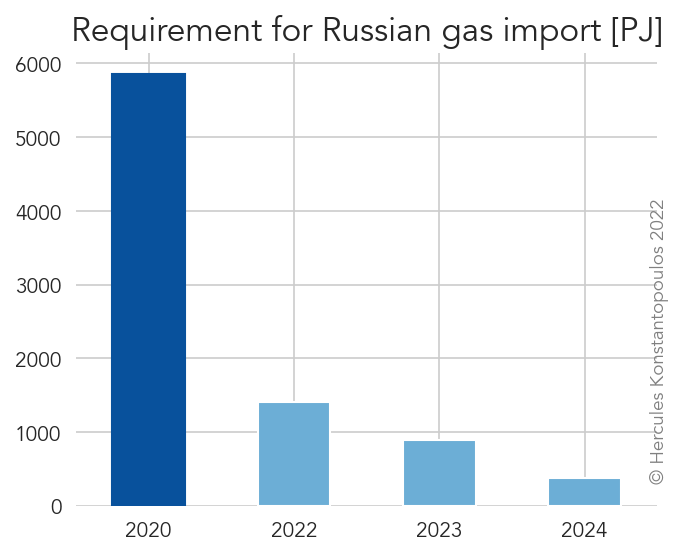 To make that feasible let’s ramp up gradually. If we start with 5% of production from each partner (adding up to 57 Mt) we can offset a third of Russian imports. Let’s now take into account the reduction scenario above, and on top of that apply alternative sourcing: 5% in 2022, and step up 1% each consecutive year.