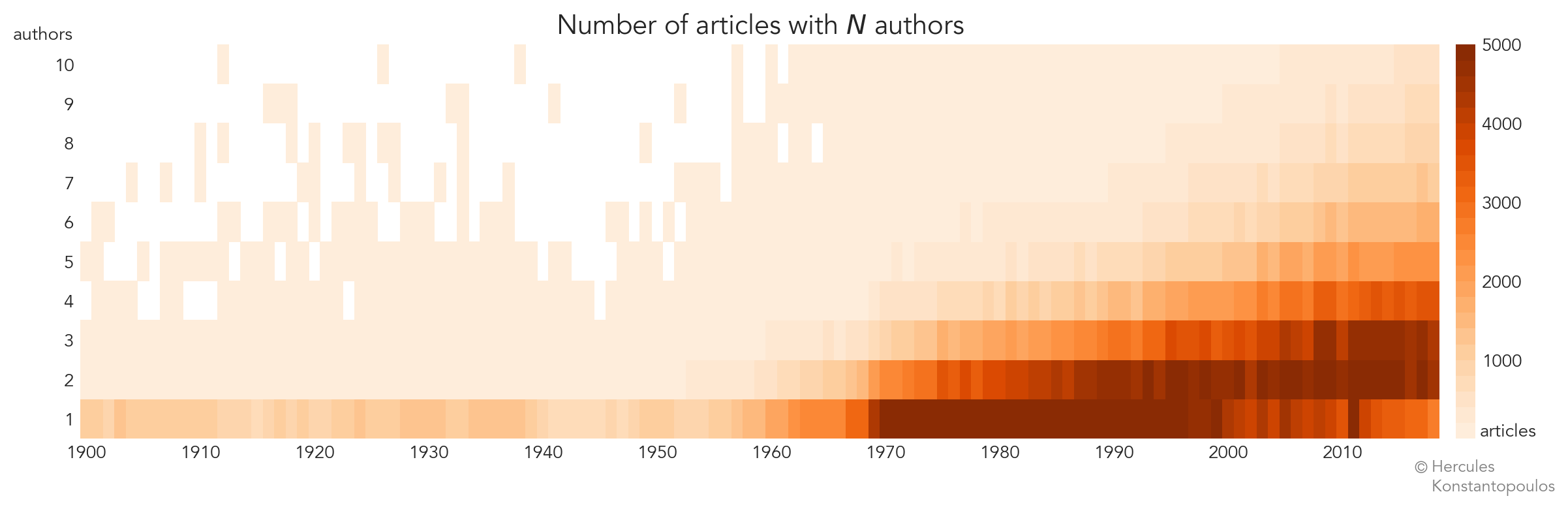 From 1900 all the way to 1970, single-author papers represented over 50% of the whole for the year. After 1970 there isn’t such a dominant mode with papers spread thin vertically.