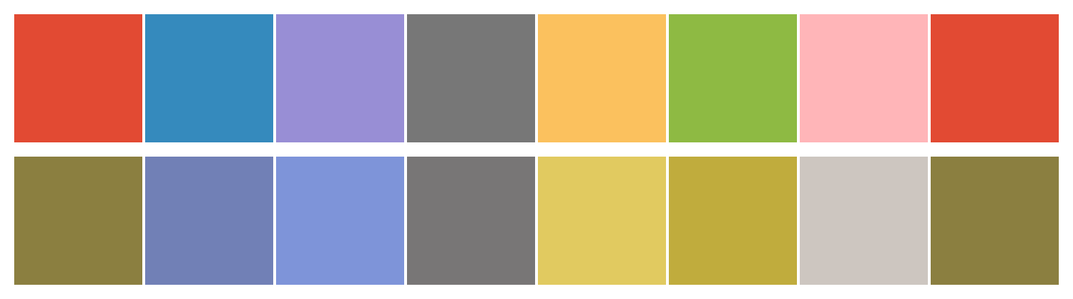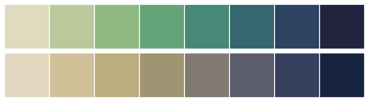 The top and bottom row may not be identical, but they will be perceived in a coherent fashion. This is a great palette to use for continuous variables, for example a colour map that tracks a certain metric over different areas.