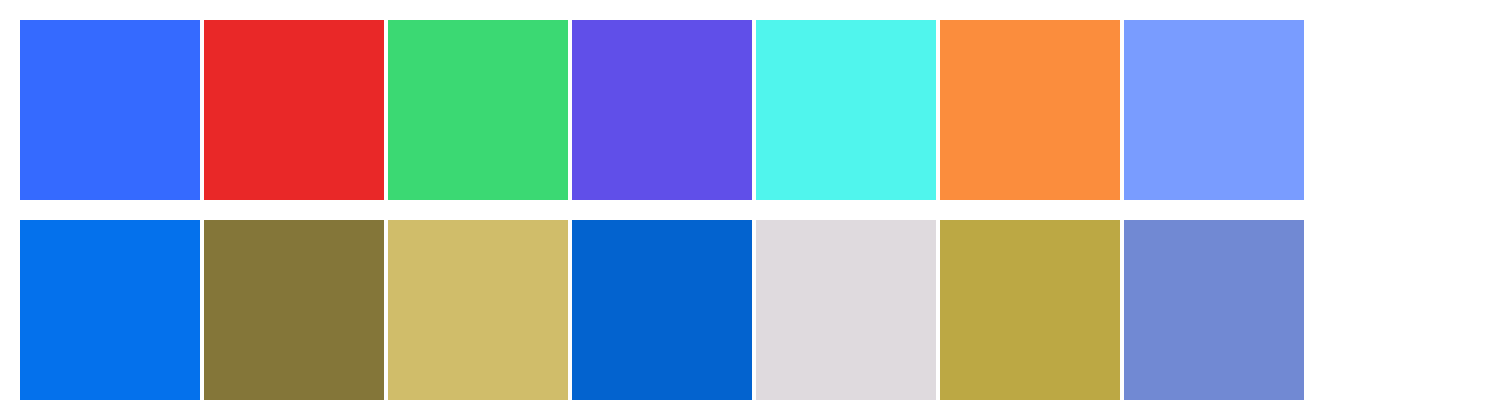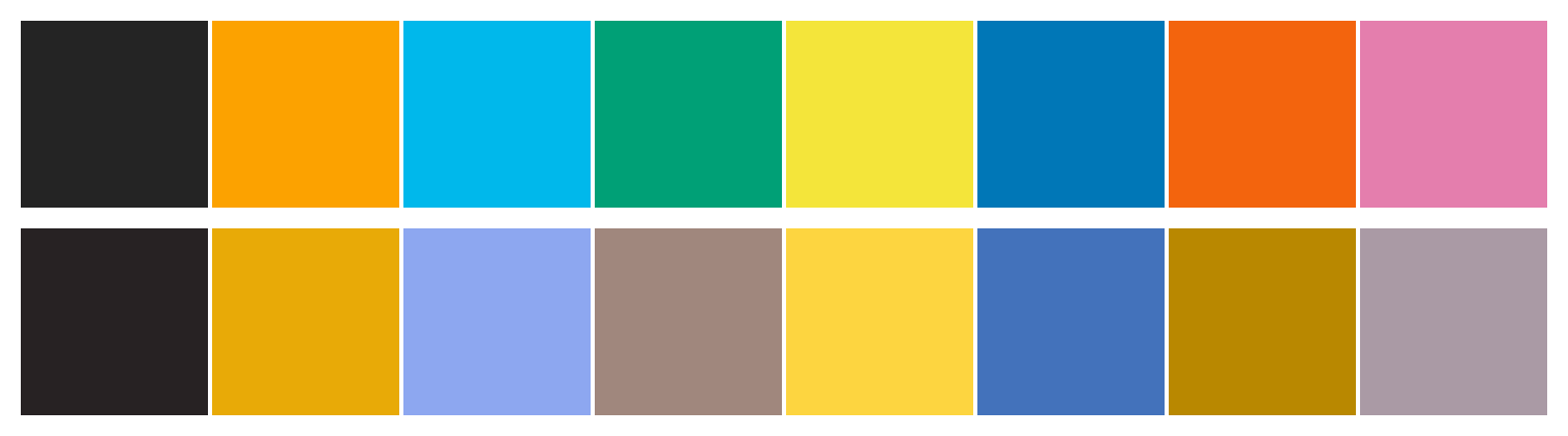Let’s look at the default palettes for a few commonly used vis tools. How do they change when we simulate deuteranopia in the bottom rows?